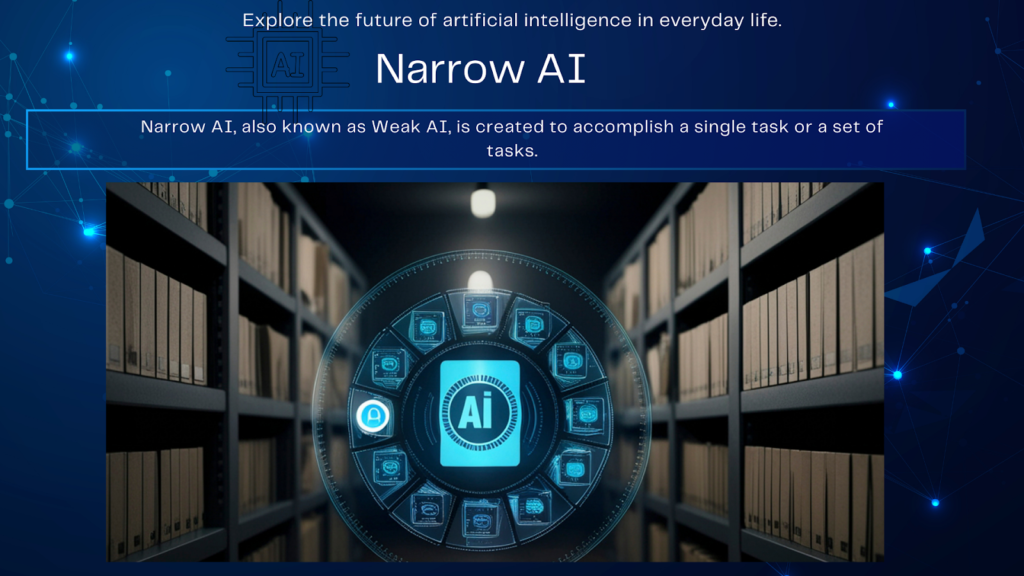 Narrow AI, also known as Weak AI, is created to accomplish a single task or a set of tasks. It is not capable of doing anything else other than what it was programmed or trained to do, and it is not capable of human-like thinking or reasoning. Narrow AI is excellent at what it does, and it can even do it better than humans, but it cannot apply its knowledge to other tasks that are not related to its original purpose