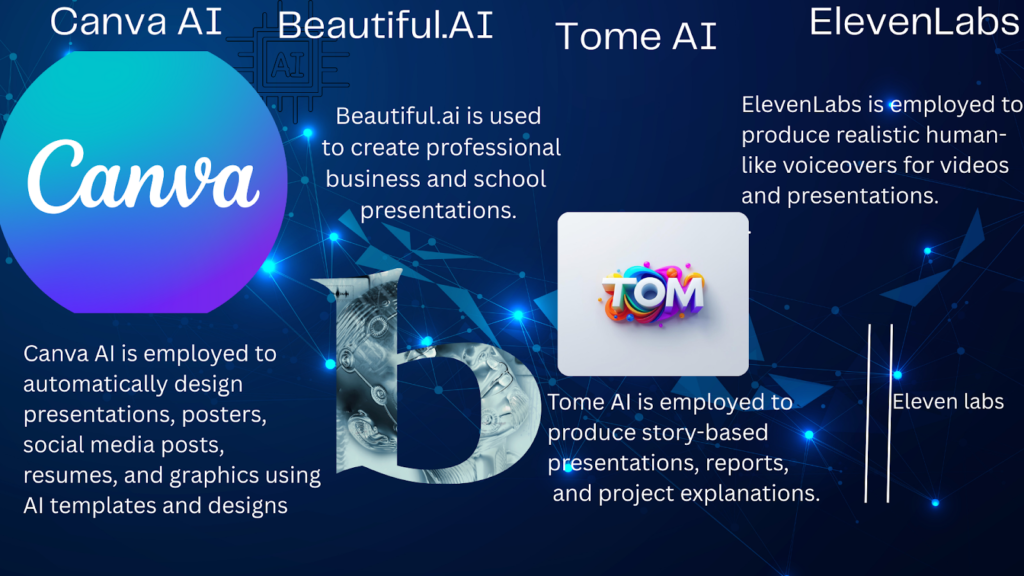 Use:Canva AI is employed to automatically design presentations, posters, social media posts, resumes, and graphics using AI templates and designs.